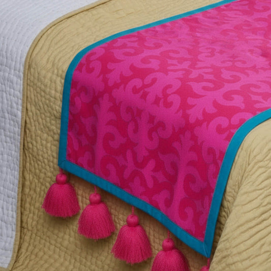 MATYO - Hot Pink Colour Bed Runner Set in Printed Cotton with Fringe - King / Queen / Twin Size