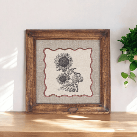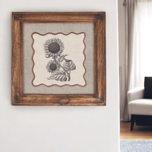 BOTANICAL wall art, Sunflower motif with teak wooden frame, 12X12 inches