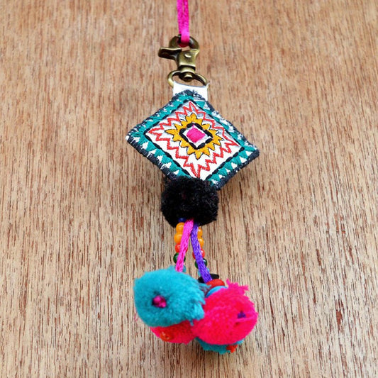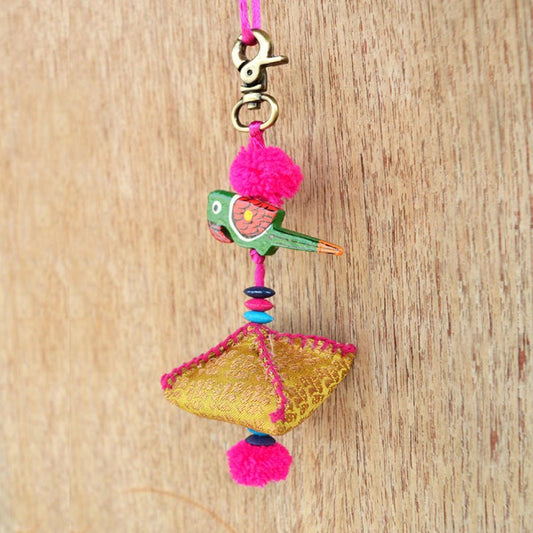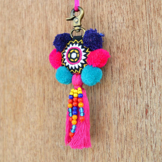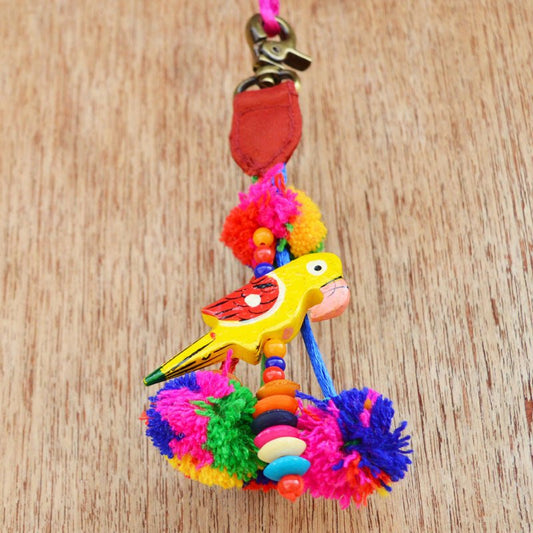 Multicolor tassel, parrot and pompom, handmade, boho bag charm, tribal, bohemian, moroccan size 5" or 12.5 cms