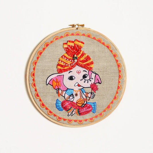 BABY GANESHA WALL ART - Embroidery & appliqued on Hoop or teak wooden frame.