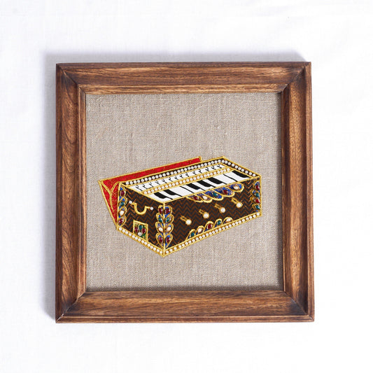 HARMONIUM Musical instrument wall art, embroidery and applique in hoop OR teak wooden frame