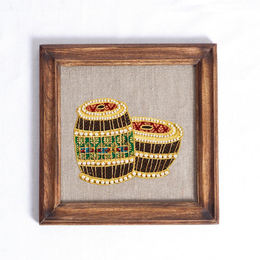 TABLA Musical instrument wall art, embroidery and applique in hoop OR teak wooden frame