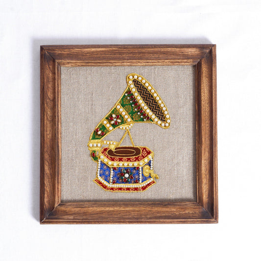 GRAMOPHONE Vintage Musical instrument wall art, embroidery and applique in hoop OR teak wooden frame