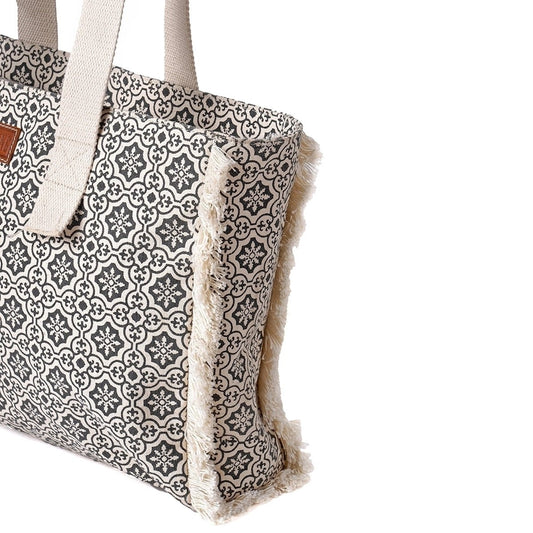 Black and white print canvas and leather tote bag, large tote, shoulder bag