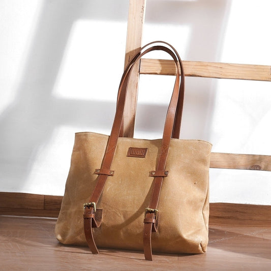 Sand Brown waxed canvas yoga bag, gym bag, leather adjustable straps, 16X13X4 inches