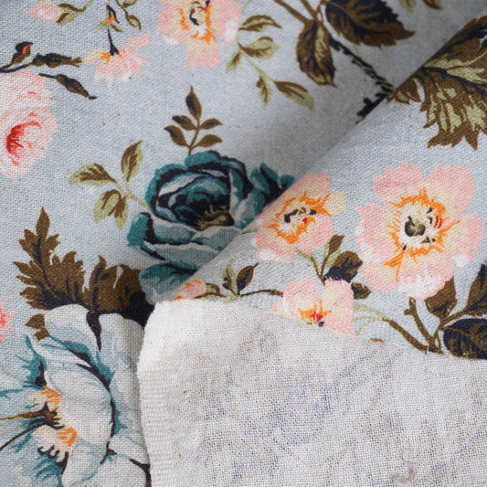 AMOUR - Duck Egg Printed Linen Fabric, vintage rose pattern, by the metre