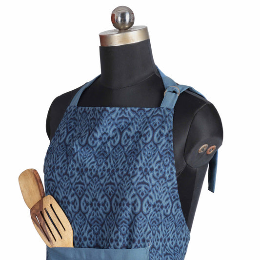 Ikat Print Indigo Blue Cotton Duck Apron with Pocket – Adjustable Straps -27X35 inches