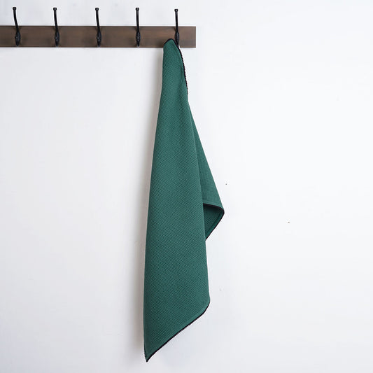 MODERN RETRO - Aqua Green waffle cotton Kitchen Towel with black micro pompom lace edging, size 20"X28"