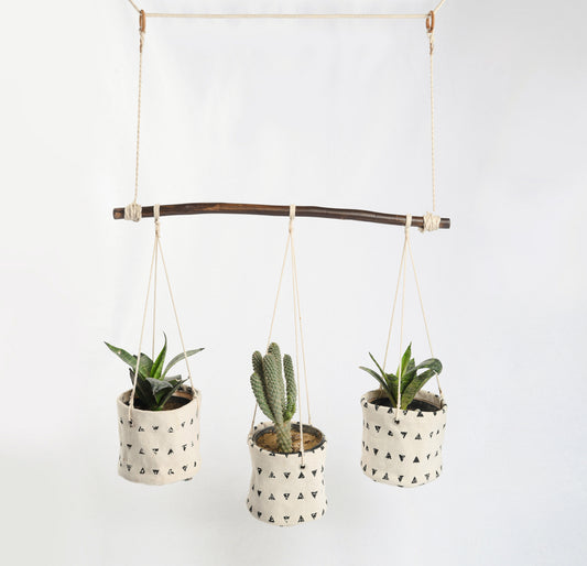 Canvas plant hanger, set of 3 baskets, triangle print, black and white, cotton canvas fabric