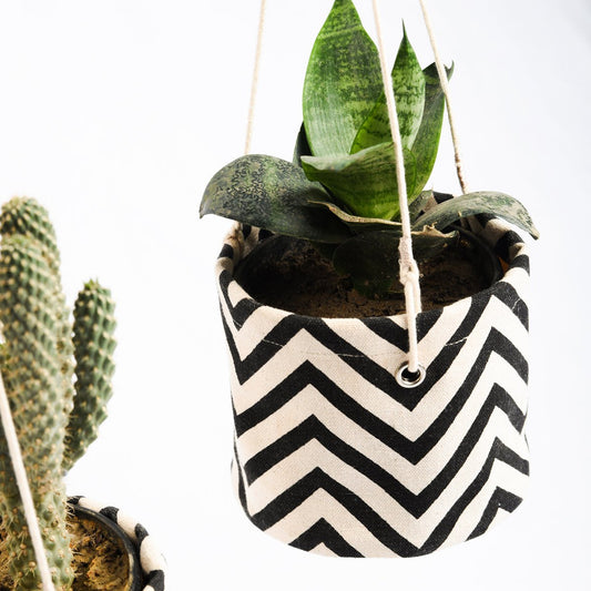 Canvas plant hanger, set of 3 baskets, chevron print, black and white, cotton canvas fabric