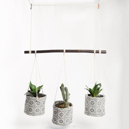 Canvas plant hanger, set of 3 baskets, tile print, black and white, cotton canvas fabric