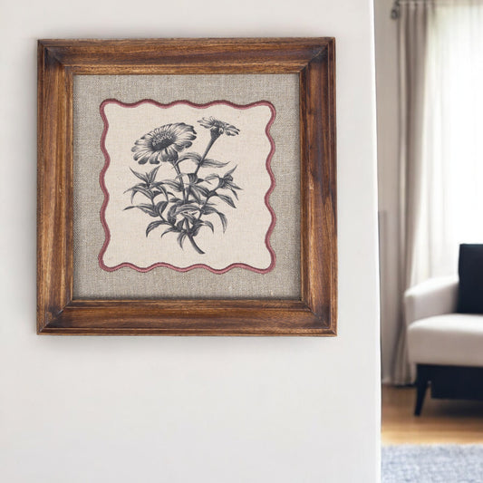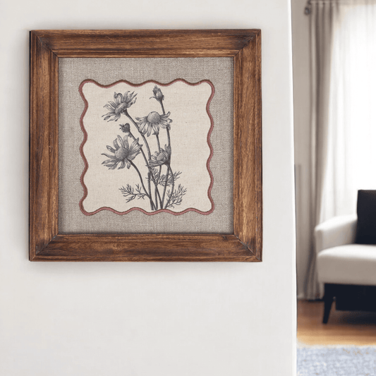 BOTANICAL wall art, Daisy motif with teak wooden frame, 12X12 inches