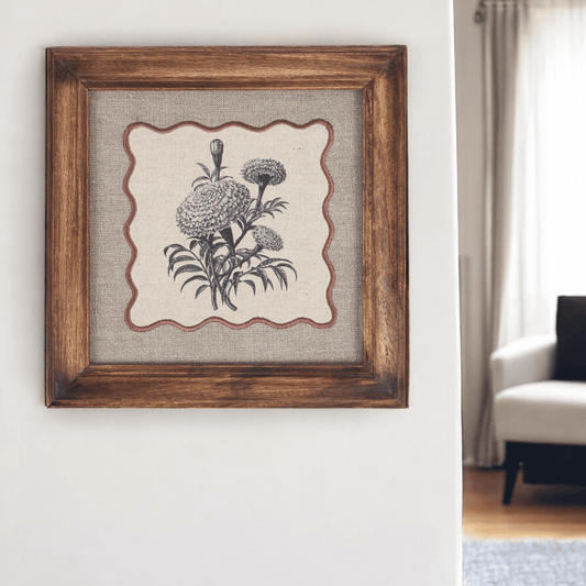 BOTANICAL wall art, Marigold motif with teak wooden frame, 12X12 inches