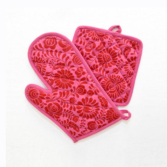 MATYO hot pink floral print Pot holder and Glove, kitchen accessory, 100% cotton, view options