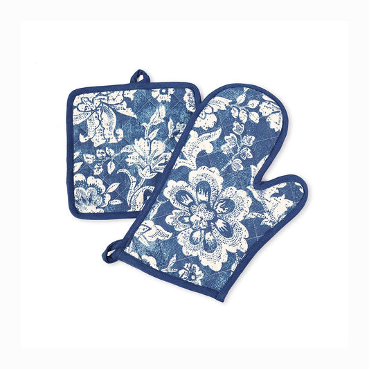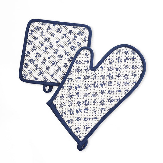 DOMINOTERIE Indigo blue floral print Pot holder and Glove, kitchen accessory, 100% cotton, view options