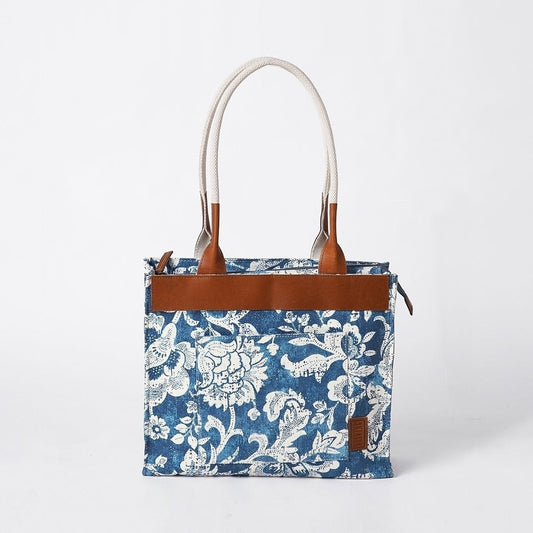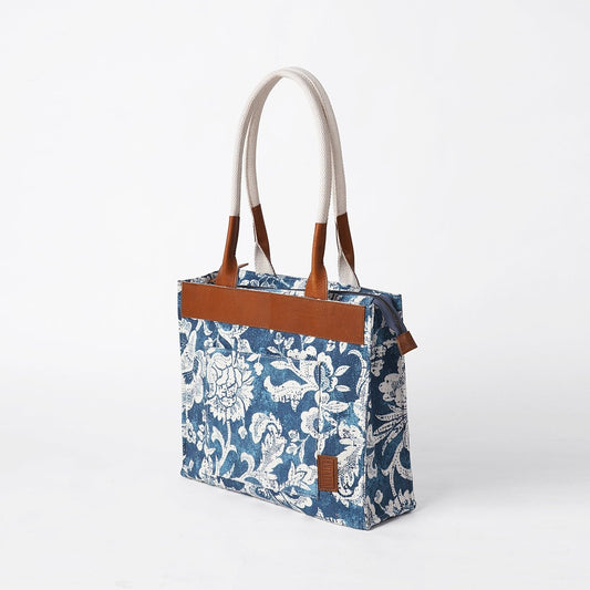 Indigo Dominoterie print cotton and leather tote bag, large tote, shoulder bag