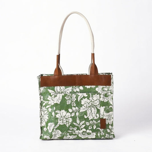 Green Dominoterie print cotton and leather tote bag, large tote, shoulder bag