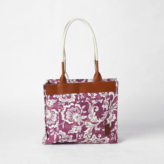 Plum Dominoterie print cotton duck and leather tote bag, large tote, shoulder bag.