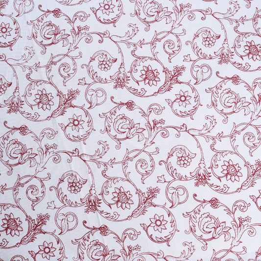 Red printed fabric, swirl pattern, Victorian pattern.