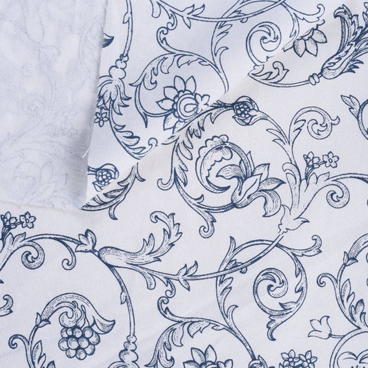 Blue printed fabric, swirl pattern, Victorian pattern.