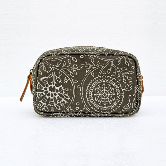 Grey toiletry bag, floral print, kalamkari print, laminated handbag, make up or cosmetic bag, utility pouch