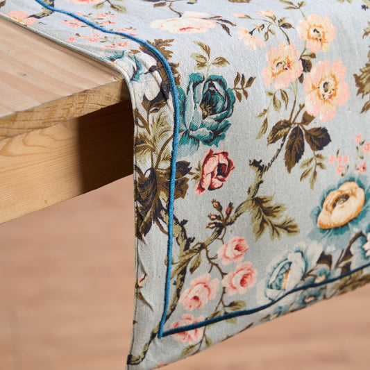 AMOUR - Duck egg linen cotton table runner, vintage rose print, sizes available