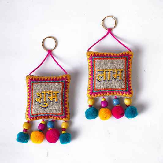 Pair of SHUBH-LABH tassels, Multicolor handmade auspicious charm, size 6" or 16 cms