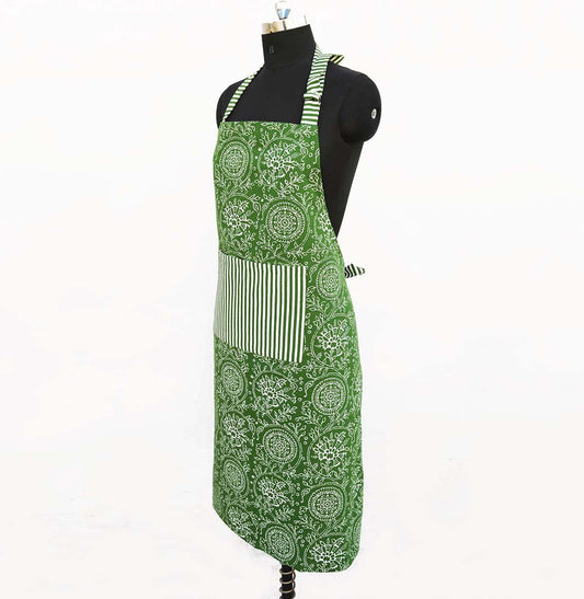 Green apron, kalamkari print, kitchen accessory, size 27X 35 inches