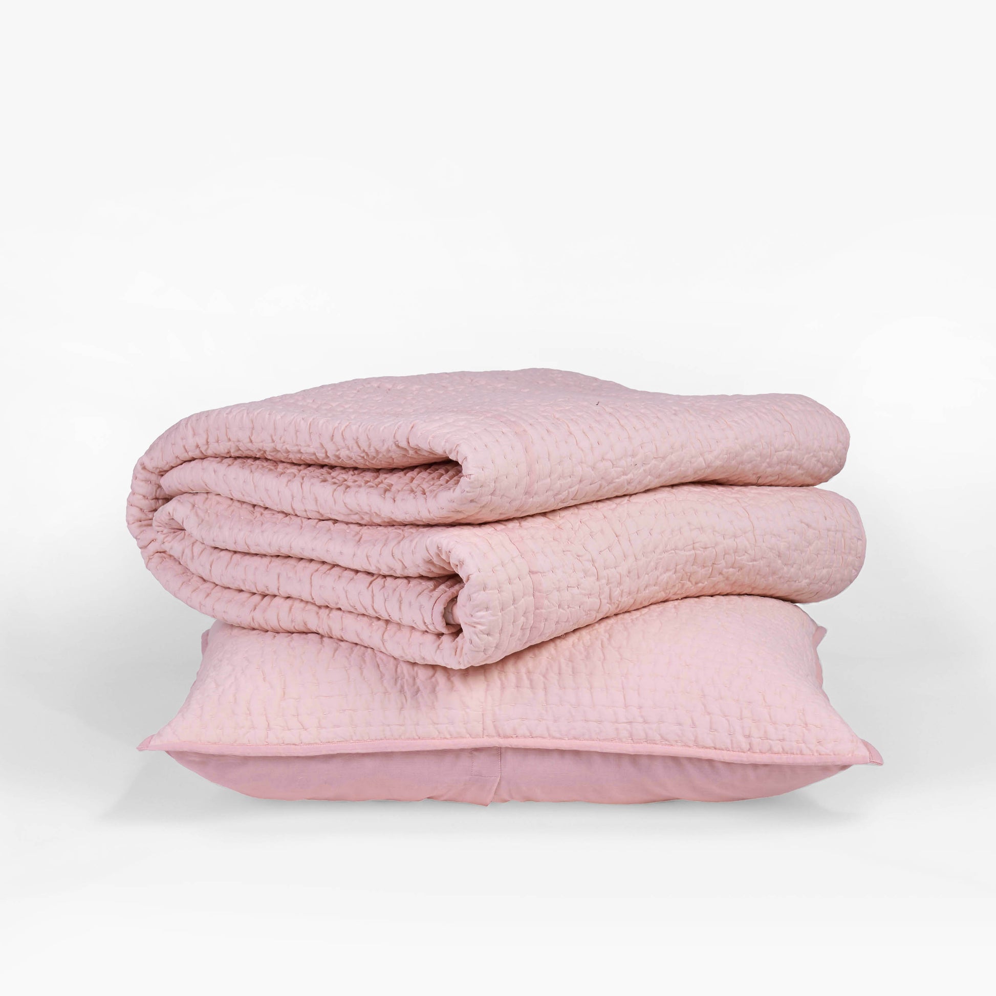 This quilted bed set is made of premium soft cotton voile fabric in front and back. The quilted bed set has 280 gsm cotton wadding and is then lined with soft cotton fabric at the back. Quilting is in classic stripe pattern in matching blush colour threads