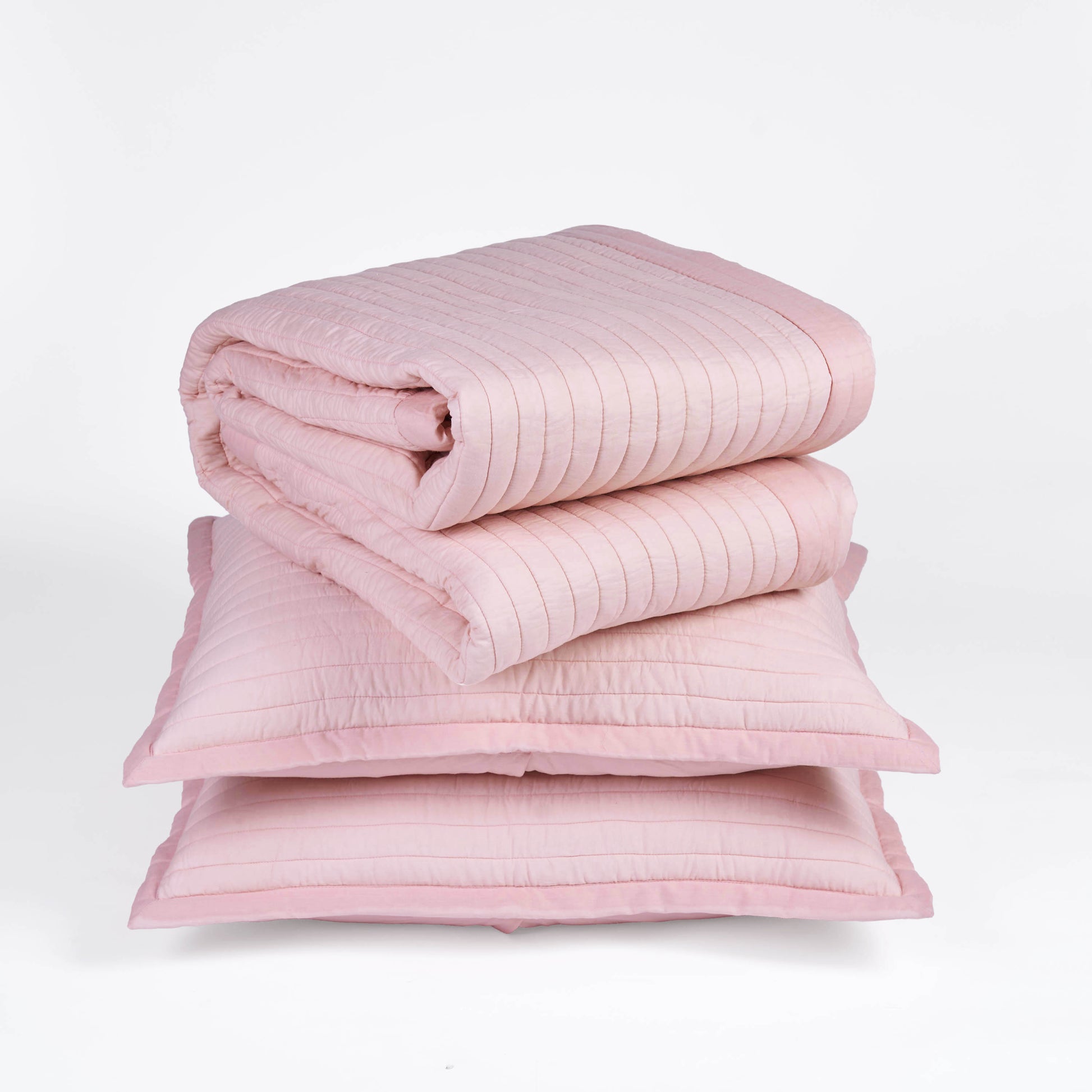 This quilted pillowcase is made of premium soft cotton voile fabric in front and back. The quilted pillowcase has 280gsm cotton wadding and is then lined with soft cotton fabric at the back. Quilting is in classic stripe pattern in blush colour threads with plain flange.