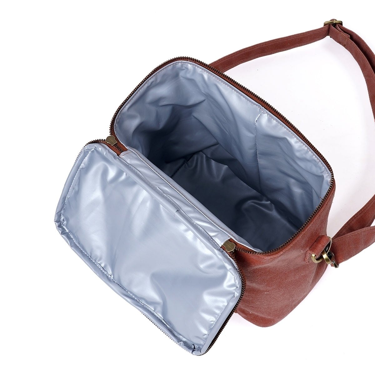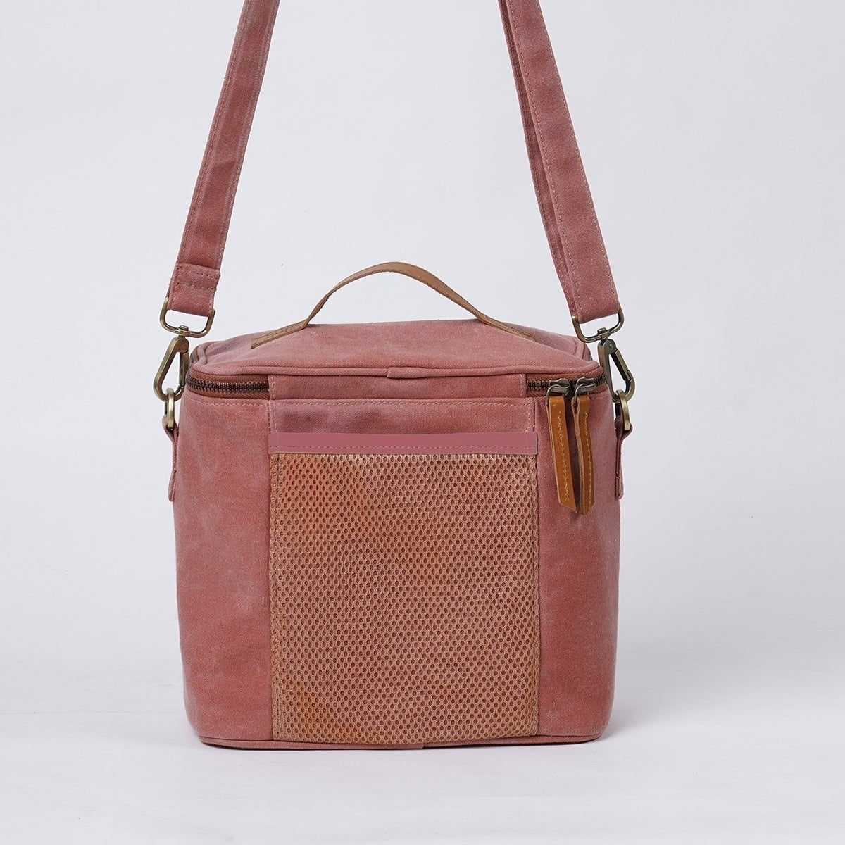 >Bag is made with brick red waxed canvas, the back has net pouch with elastic to hold other lunch accessories.