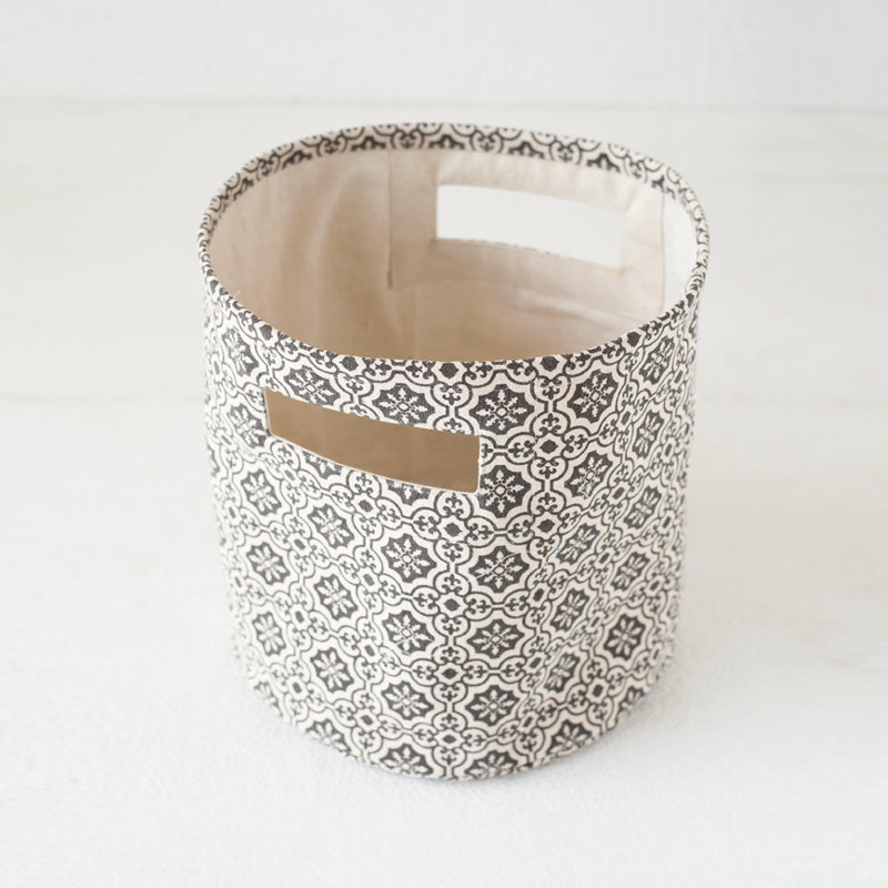 Black tile print is printed on off white canvas which is sturdy to keep its shape. The basket has handles cut out on two sides and the inside is lined with off white cotton sheeting.