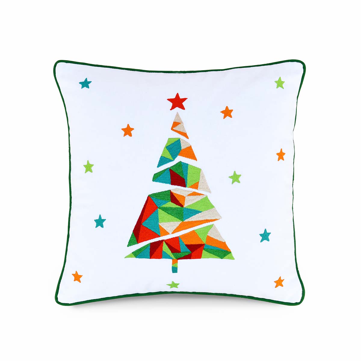 The christmas pillow cover has the classic christmas tree embroidered with geometrical pattern in it.