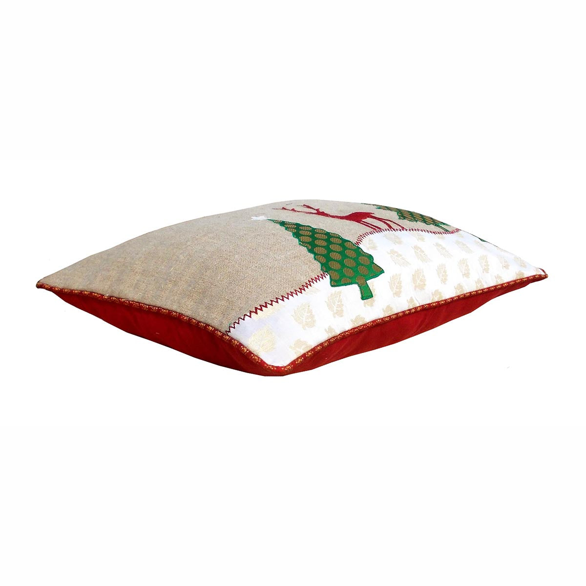 The christmas pillow cover is a unique combination of a very natural & matte burlap like linen appliqued with rich and festive indian brocade. The pillow is accented with embroidery and is welted with red brocade.