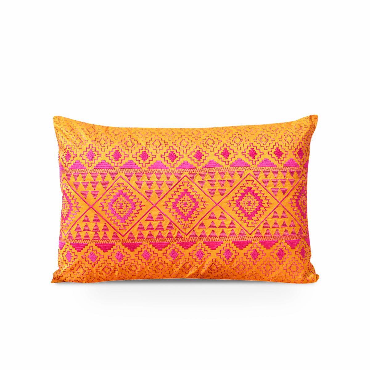 The pillow is inspired by classic Kilim patterns. The bright orange polytafetta is intricately embroidered in bright pink color.