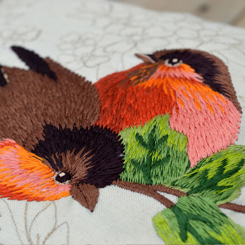 The birds and the twig with the leaves and berries, the flowers and leaf outlines in the background are all embroidered. The base fabric is off white cotton duck fabric.