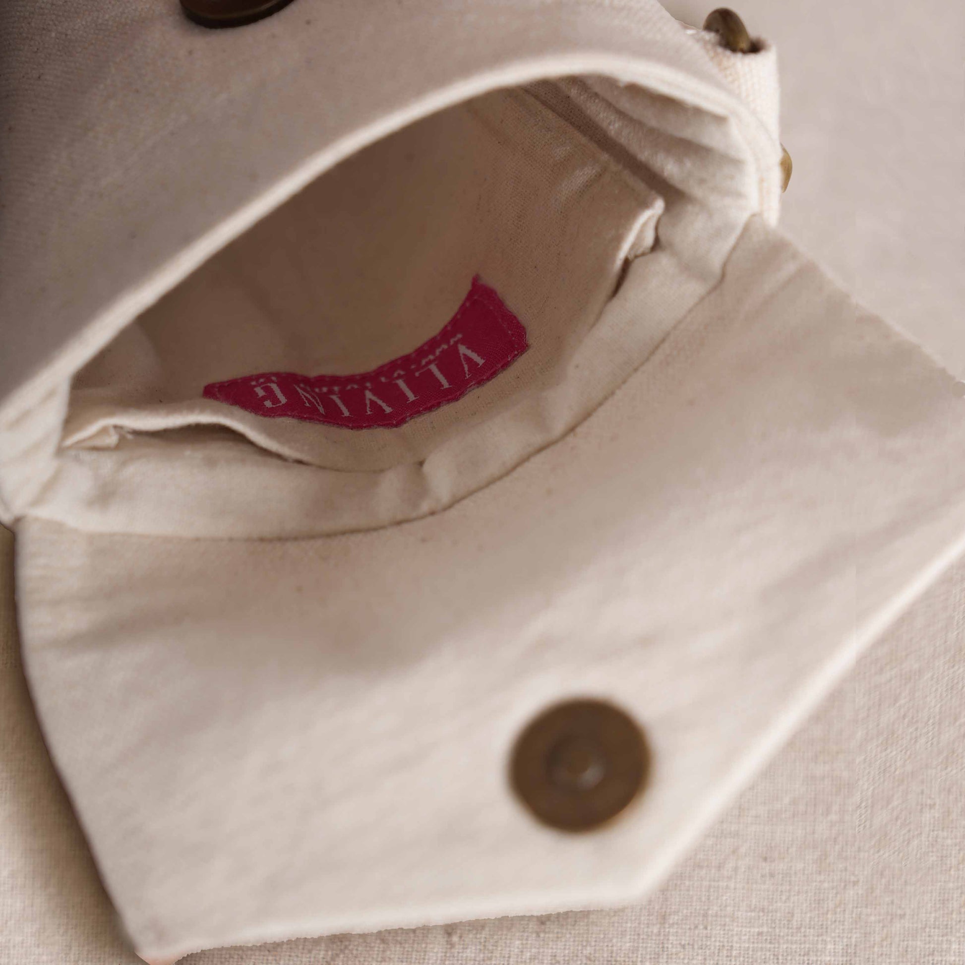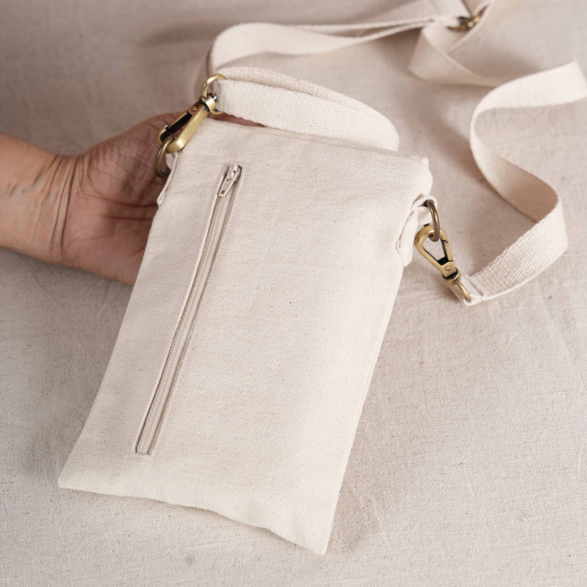 Crafted in durable cotton canvas, the bag features floral hand embroidery on the front and a zippered pocket at the back for extra convenience. Its adjustable cotton sling strap makes it versatile and comfortable to wear across the body or on the shoulder.