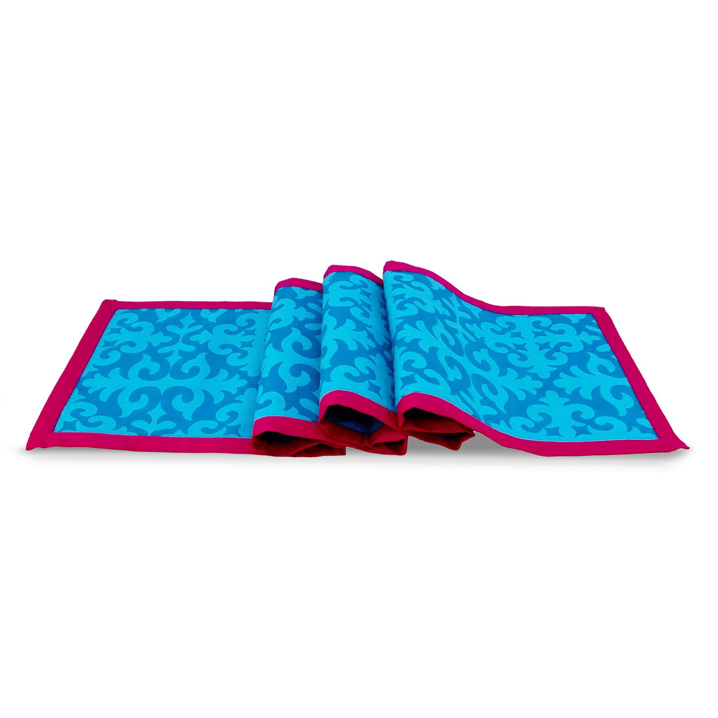 A Turuoise tone on tone print table runner with 1 inch border in bright pink on all 4 sides.
