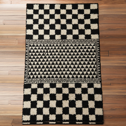 Moroccan Hand Knotted Wool Blend Carpet - Black and white