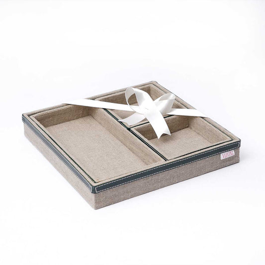 Trays in Natural Linen with green Leather trims, Rustic Holiday Decor Christmas, sizes available