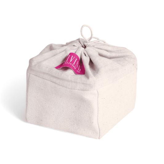 Pack of 6 mango wood coasters packed in a canvas drawstring bag.
