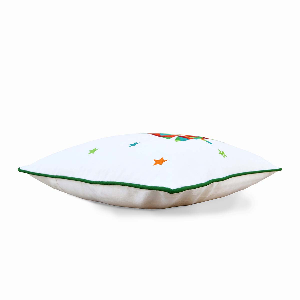 The pillow is accented with green color welting.